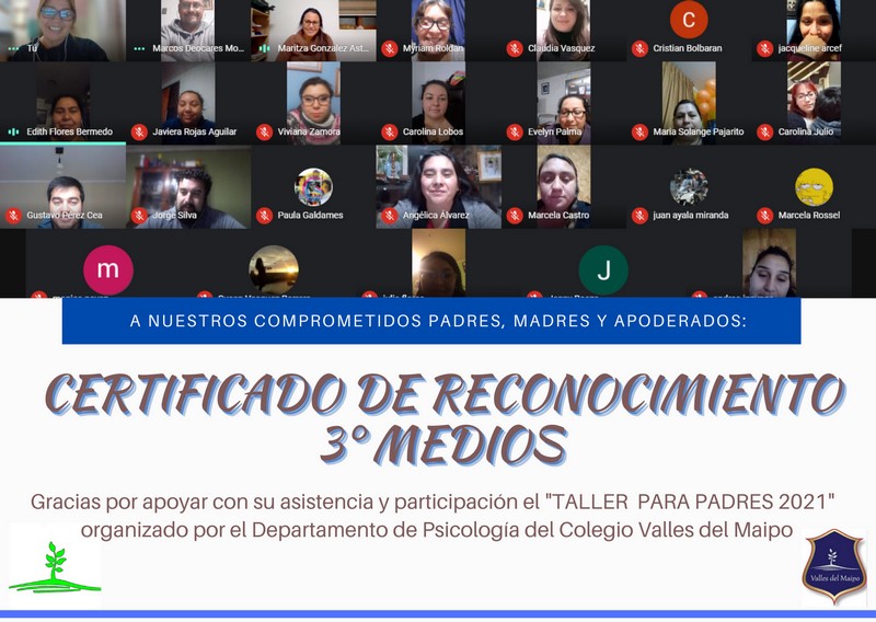 El Departamento de Psicología y Convivencia Escolar, entrega Certificado de Reconocimiento a las Madres, Padres y Apoderados de los 3° Medios 2021, por su destacada participación y asistencia a los Talleres para Padres, realizados este Primer Trimestre.